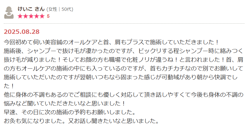 | 内容 | 気になる所に集中鍼 | 首肩こり電気鍼 | 薄毛・抜毛 |