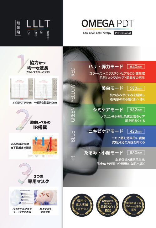 - それぞれの波長には、コラーゲン生成促進(赤色)、ニキビ菌の除去(青色)、色素沈着の軽減(緑色)、赤みやくすみの軽減(黄色)などの特定の効果があります。